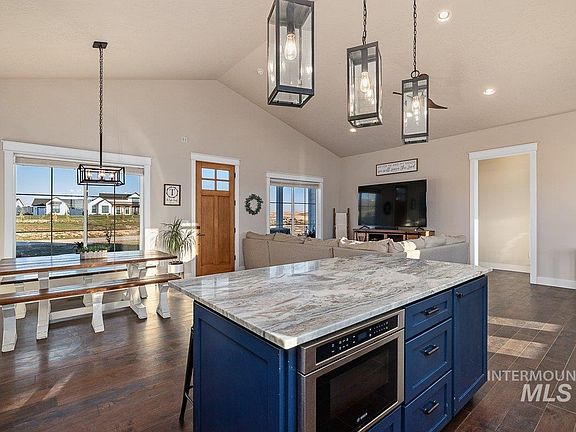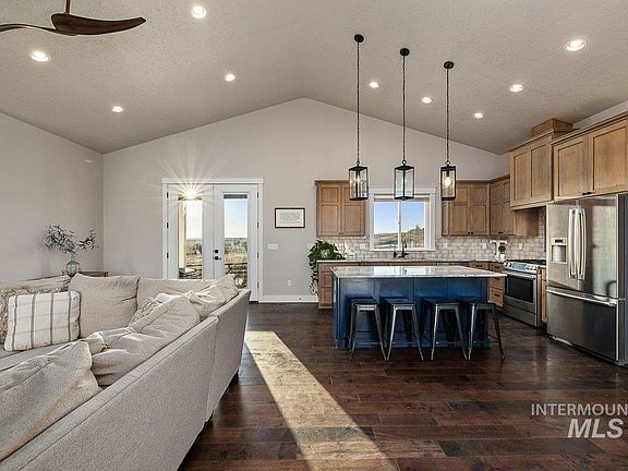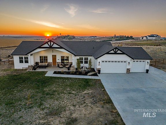 This beautiful custom built home situated on 5 acres with NO HOA is located in High Vista Estates which is surrounded by mountain views and BLM land. Tons of space for your animals and vehicles, as there is a newer extended driveway which has RV parking. You have space and freedom to build a Shop or an ADU. The bright and open floor plan has vaulted ceilings, split bedroom floor plan, two bedrooms that share a Jack & Jill bathroom w/ dual vanities & walk-in closets, water softener, reverse osmosis system, and newer exterior paint. The kitchen includes custom cabinetry, granite countertops, full tile backsplash, island, butler pantry, and Bosch stainless steel appliances. The main ensuite has a tray ceiling, walk-in closet, dual vanities, tiled walk-in shower w/ a newer glass door, soaker tub, and door to covered back patio. The laundry room has a deep utility sink, cabinets, folding areas, and storage closet. Located between Middleton and Emmett, and I-84 is less than 15 minutes away!