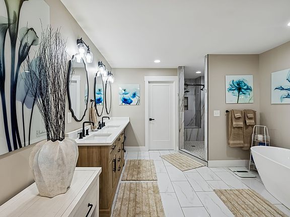 The primary suite is a private retreat with direct access to the back patio and a luxury bath designed for unwinding. An exquisite tiled walk-in shower, soaking tub, and dual walk-in closets create a space that feels restorative rather than routine.