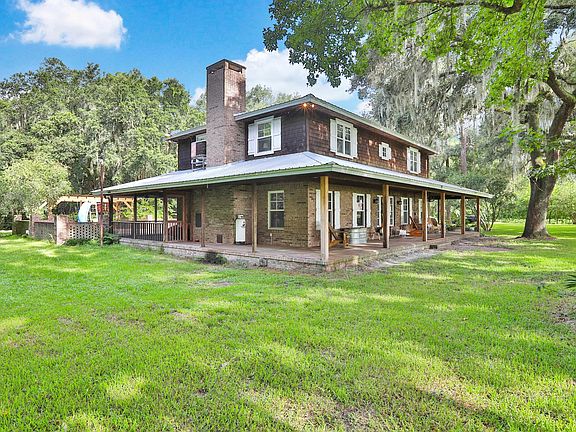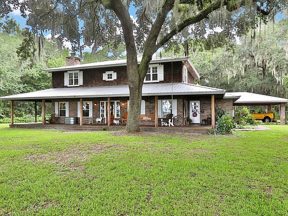 Southern living at its finest. If this home could talk, the story it would tell. From the reclaimed heart pine barn-wood flooring from the 1800's to the locally harvested cedar lined master closet.Custom farm-style pool home nestled underneath a canopy of mature oaks on a 10.5 acre oasis. A one of a kind home with many features to include; wood & tile flooring throughout, antique bathroom cabinets, mudroom, beautiful brick fireplace, tankless water heater, gourmet kitchen w/ stainless appliances, granite countertops, farm sink, Vulcan range, subway tile backsplash & center cooking island. Staircase leads to second floor w/ reclaimed wood flooring, two bedrooms plus a large primary suite featuring his & hers closets, barn door, soaking tub & large walk in shower.
