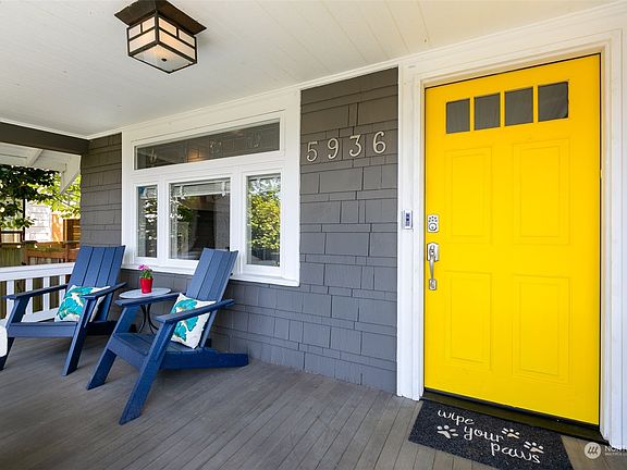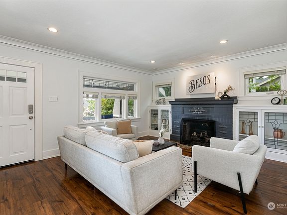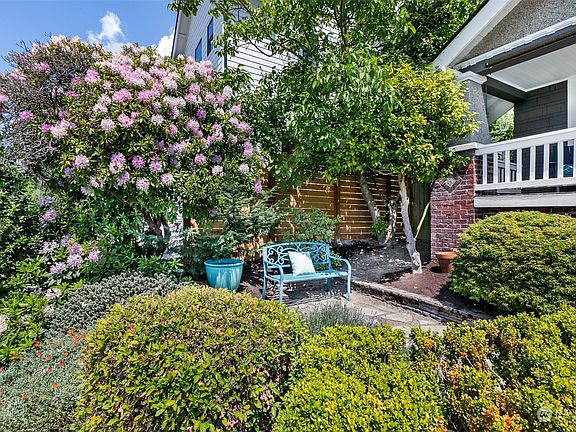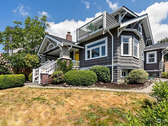 Old-world charm,perched high above the street, overlooking beautiful sound & mountain views.Inviting covered front porch, perfect extra living space.Light-filled living w/leaded glass built-ins & gas fireplace. French doors to spacious formal dining w/original built-in. Updated kitchen w/Viking stove/hood, slab granite, shaker cabinets &nook.2 bedrooms & bath on the main.Primary suite has sitting room/office & balcony w/expansive views.Ample storage.Fully finished basement w/extra finished room could be 4th bdrm, playroom, office or guest suite,3/4 bathroom & laundry.Central AC, 75 gallon water heather.Newer 220 amp panel,fenced back yard w/patio.Alley access 2 car gar+2 extra parking spots.Walking distance to parks, farmer market & dining.