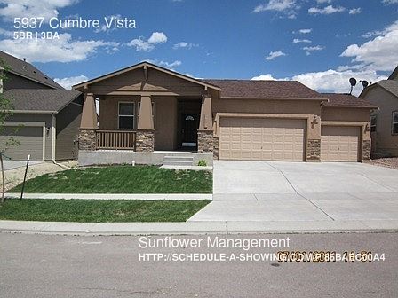 SCHEDULE A SHOWING ONLINE AT: showmojo.com/lh/86baec00a4 AVAILABLE FOR SHOWINGS AS OF 4/2/2018 AVAILABLE FOR MOVE IN 5/28/18 Welcome home to the well-manicured Cumbre Vista neighborhood in Northeast Colorado Springs! This stunning executive home is located just off of Woodmen and Powers Blvd corridor near local shopping, dining and entertainment. It is located in School District 20. The newer styled built home features tasteful paint colors, large fenced back yard, fireplace, separate shower and bath tub in master, washer and dryer hook-ups, and a large 3 car garage. 12 month lease Back Yard Blinds Carpet Ceiling Fan Finished Basement Island Linoleum Scenic View Stove Vaulted Ceilings Walk In Closet(S) Washer / Dryer Hookups Window Coverings