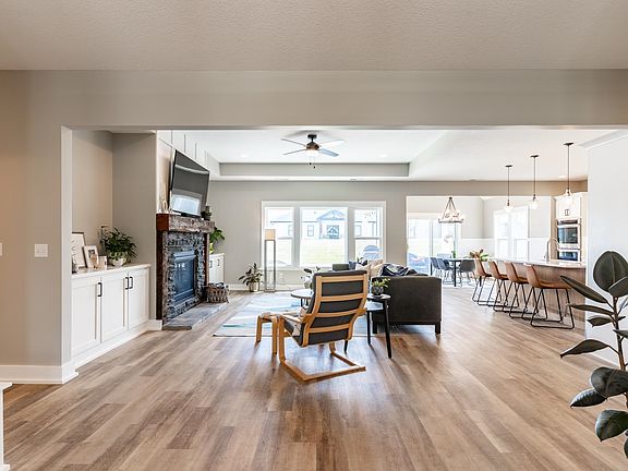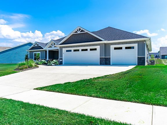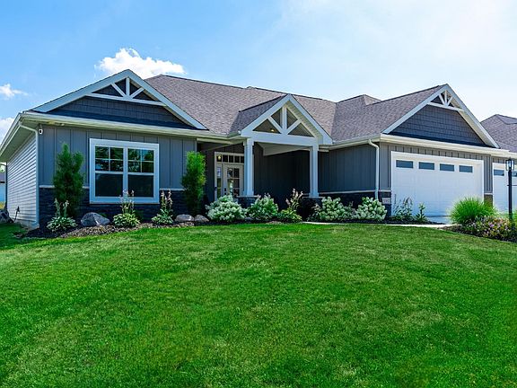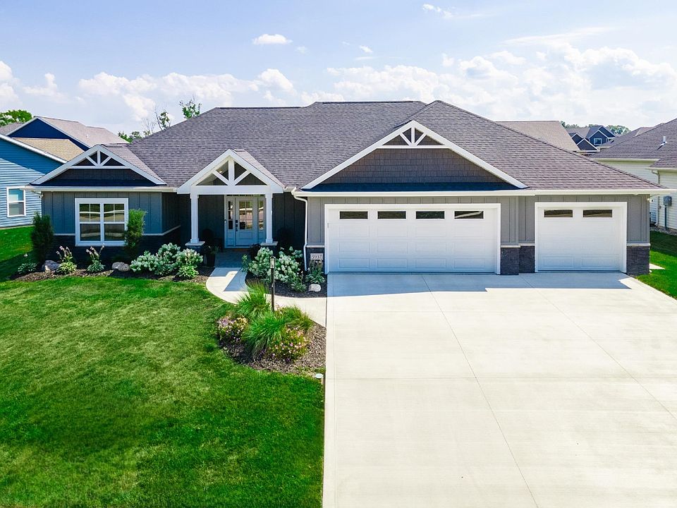 This practically new Rivers Edge build is in pristine condition and features high-end finishes throughout. Lush professional landscaping and a large Craftsman styled covered front entry will welcome you in. Step into a foyer filled with light from the Great Rooms picture windows and views of a Living Area anchored by a focal point stone & timber fireplace flanked with built-ins, and a gourmet kitchen featuring built-in double ovens, a 6-burner gas range, herringbone tile backsplash, quartz countertops, craftsman style cabinetry, and an oversized kitchen island. Adjacent to the Kitchen is a vaulted dining area with a beamed ceiling, oversized 2-tier hoop chandelier, and sliding doors that access the covered Veranda & the additional oversized patio. The Homes split floorplan is comprised of a Master Suite featuring a tray ceiling, black shiplap accent wall, sliding barn door, en suite with a glass enclosed chic tile shower, quartz topped vanity, and custom walk-in closet. The other side of the Home offers two identical Guestrooms and a shared Full Bath featuring its own dual quartz topped vanity and a beautiful subway tile guest bath-shower combo. Don't forget to check out the immaculate epoxy floored 3-car garage & finished heated & cooled workshop. Buckner's Crossing is a mixed builder community which is home to many stunning ponds, the nearby Buckner's Park and walking trails, and is conveniently located between both Northwest and Southwest Fort Wayne & near both large employers Amazon & Sweetwater. Schedule your tour of this luxury home today!