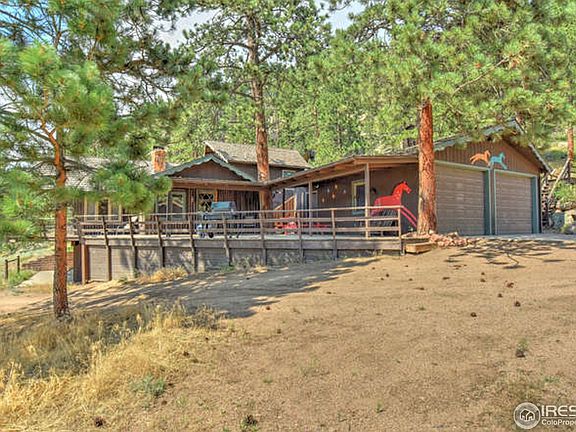 Beautiful log home sitting on 12+ acres with stunning views, wonderful barn and gorgeous rock outcroppings. Home boasts a lovely moss rock fireplace, vaulted ceilings, new bath, multiple decks and great in-law/teen suite or guest quarters. New bathroom tastefully redone down to studs. Mountain and valley views. Three stall barn has water + tack room. Bring our horses/animals + dog run. Two outbuildings with power & heated garage. Easy access to Estes Park/Front Range. Potential.