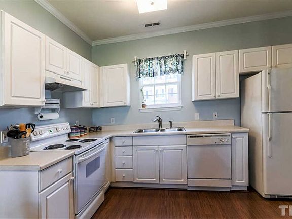 Fantastic opportunity to live just minutes from 540, Capital Blvd, and 401! This well-maintained townhome offers 2 large bedrooms, each with their own full bath. The master bedroom has a vaulted ceiling and garden tub. The living room welcomes you in with a corner gas fireplace (new logs) and built-in bookshelves. Crown molding and beautiful laminate flooring throughout downstairs. French doors lead out to a private patio, outside storage, and open green space. Refrig/W/D convey. Water heater <4yrs old.