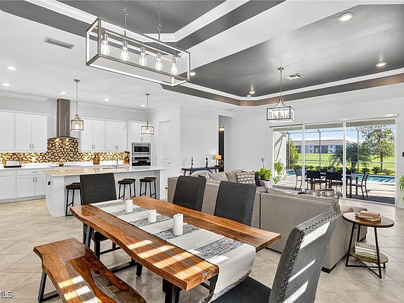 Take a look at what could be your new home in The National - A gated community located in Ave Maria! This home is known as the Maria model and contains MANY interior and exterior upgrades. With this layout, you get 4 spacious bedrooms, 3 full bathrooms, almost 2,300 square feet of living space and a 2-car garage. In that same garage, sellers have added garage door insulation and overhead shelving in addition the owner relocated the air handler from the ceiling to ground level for optimal performance and easier maintenance. Walking into this home you will find a inviting foyer and open living area, beautiful tray ceilings with integrated lighting, and tasteful ceiling fixtures. Your dining room is integrated into the great room space. The gourmet kitchen overlooks your living room and features rich white cabinetry, glass backsplash, quartz countertops, microwave and wall oven in cabinet, a walk-in pantry, under-cabinet lighting, and stainless steel appliances. - perfect for cooking enthusiasts. Just around the corner you have your spacious primary bedroom and bathroom with tile flooring, dual sinks and a glass enclosed shower. Giving ample privacy to everyone residing, your guest bedrooms and bathrooms are on the opposite side of the home. The upgraded bathrooms showcase sleek glass shower doors, with one even offering a private en-suite! On that same side of the home is where you will find your laundry room which includes the appliance package, cabinetry and a sink. Adding to the safety of this home, you have hurricane accordion shutters on windows, coupled with hurricane screens on the lanai and entry. Last, but certainly not least, step outside onto your private lanai, and enjoy panoramic views of the golf course and lake with northeast exposure. That means endless skies by your pool! Exterior updates include an upgraded summer kitchen with a BBQ grill, hood, and mini fridge. Not a detail in this home has been overlooked! Outside of your home and within the gates of The National Golf & CC, boasts an 18-hole championship golf course, a large resort-style pool, a Chickee Bar, 6 Har-Tru tennis courts, 8 pickleball courts, and 2 bocce ball courts. Outside of the gates, you can enjoy North & South Parks, water park, Ave Maria University events, local dining, shopping and so much more! Come experience everything you need in the fastest growing area in Naples!