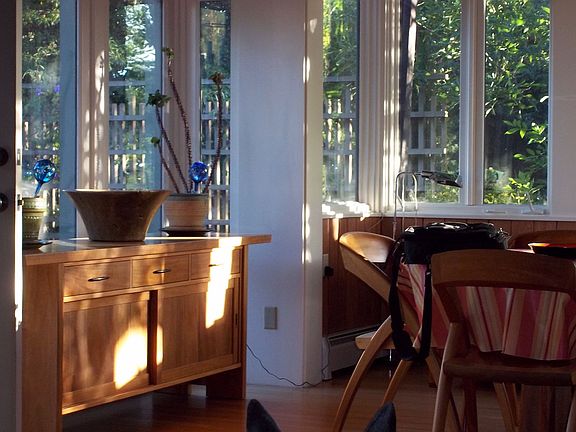 An urban treehouse 1 block to Rockridge BART with high end features: gourmet kitchen, radiant heat, hardwood floors, 15 foot ceilings in open living/dining rooms, nook for study or yoga, mahogany built-ins. Two bedrooms and 1 cool bathroom. Carport and garage (or new ADU?) plus 2 outdoor storage units. New roof and other improvements made within 2 years!
