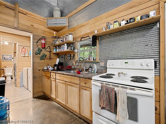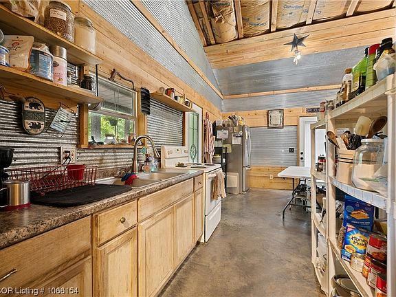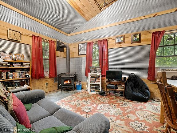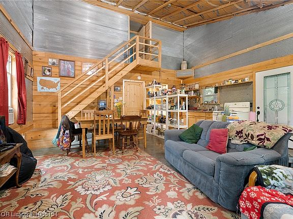 Look at this beautiful metal structured Semi-Barniminium, setting on 4 acres with Nation Forest on East & West sides. Inside is like stepping back in time with a mixture of wood and iron work. It has tall 2 story ceilings with a cozy cottage feeling. Flooring is smooth cement with the open concept. Master bedroom in downstairs and Two bedrooms upstairs. Wood stove to bring warmth in the cold days. and beautiful trees for shade in the Summer. So many ways to decorate this home. Bring your Tea or Coffee and relax while you listen and watch the beauty of nature around you.