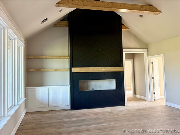 Living room is open to the kitchen for the perfect entertaining space & has vaulted ceilings, gorgeous beams, double ceiling fans, & a stunning statement fireplace with shelving surrounding it.