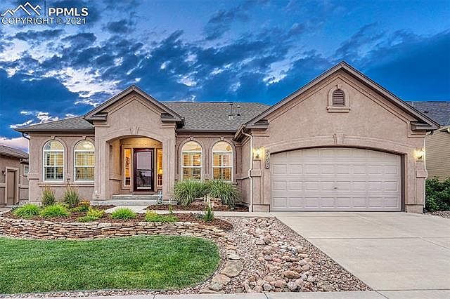 Impeccable stucco Rancher in D20 Wolf Ranch neighborhood. Open floor plan w/lots of light throughout. One-owner, dog and cat free, immaculately maintained like-new home. Great entertaining spaces upstairs and down. Covered entry opens to hardwood floors. The entry leads to the formal Dining Rm featuring arched windows w/plantation shutters & open views to the Great Rm & Kitchen. The Great Rm features a lighted CF, a gas-log fireplace w/tile surround, & a wall of windows w/2-inch blinds. There is a good sized Dining Nook off the Kitchen for informal dining w/slider to the backyard. The Kitchen offers Merillat cabinets w/crown molding, travertine tile backsplash, & Corian countertops. There is a full breakfast bar, large pantry. Appl include a gas range oven, dishwasher, microwave, & refrigerator. The Laundry Rm includes the washer & dryer & has access to the garage. The ML MBR features a lighted CF, windows w/2-inch blinds, & 5pc Master Bath. The Master Bath has a dual sink vanity w/leather look countertop, top-down bottom-up shade over the soaking tub, separate tiled shower, & walk-in closet. ML BR #2 (currently an office) w/lighted CF & arched windows w/plantation shutters. The Hall Bathroom includes a vanity & tiled tub/shower. Iron stair rails lead to a large, finished Bsmt w/Family Rm, Workout Area, 3 BRs (1w/dual closets & 1 w/walk-in closet) & full Bathroom. The Family Rm is pre-wired for surround sound. Large Mechanical Rm w/extra storage space. Central air, sec sys, new water htr. Beautifully landscaped yard~one of the larger in the area. Patio & lush lawn area w/rock river bed. Extra patio could be added easily in the rear of home. Wolf Ranch is a Master Planned Community that offers a Rec Center (separate fee), parks, pool w/splash park, walking trails, playgrounds, a stocked lake, & summer concerts in the park. Close to entertainment, hospitals, & shopping. Easy access to the Powers Corridor, Hwy 83, & I-25 for commuting to Denver & downtown Col Spgs.