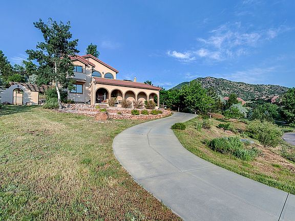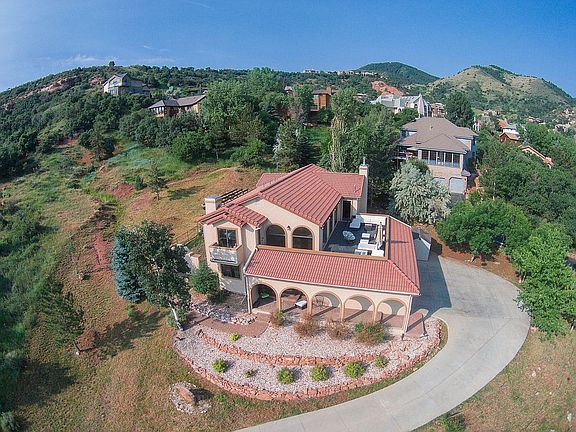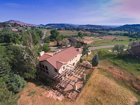 Mountain Contemporary with quick possession. Fabulous lot borders open space, private. Spectacular views of Denver skyline, amazing sunrises and moonrises. Open plan with huge arched windows. Kitchen upgrades of granite, SS appl, rustic cherry cabinets, slate, travertine. Covered patio for entertaining. Remod baths, mstr has dbl shower, heated floors. 5 bedrooms plus office. Golf community, 800 acres private open space.