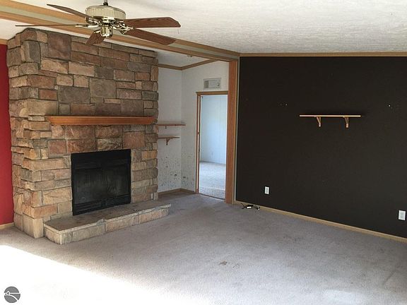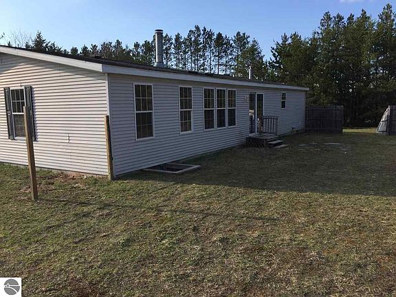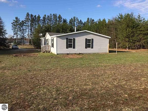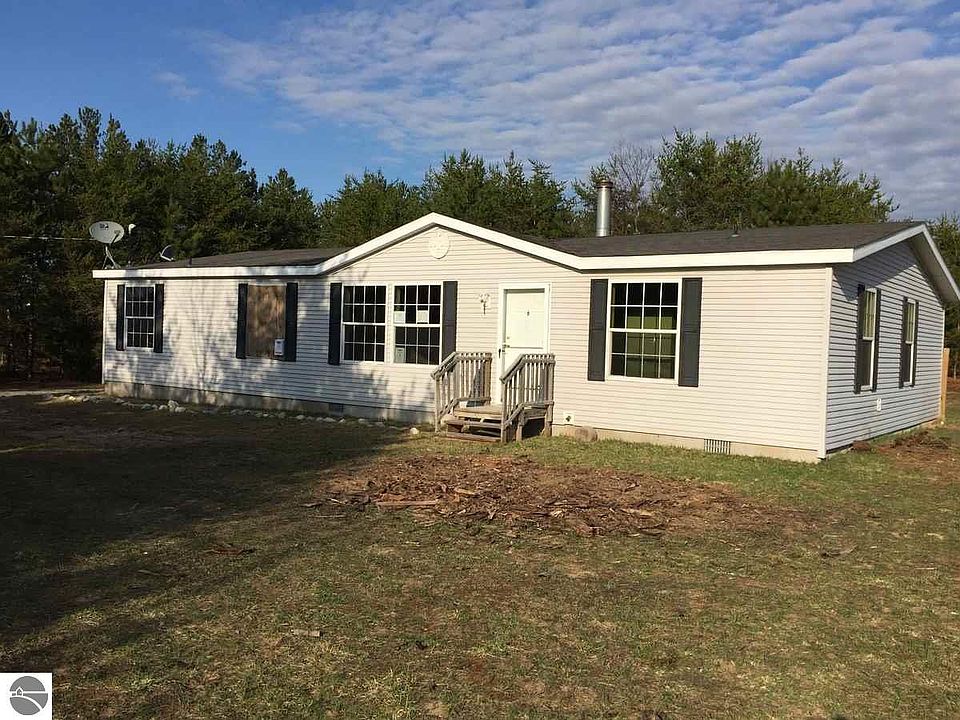 Manufactured home on 5 acres, just north of Kalkaska. This home has a nice floor plan, including master suite, mud room/laundry room, 3 bedrooms, and formal dining room or den, in addition to a large kitchen with dining area. The living room features a nice stone fireplace. The home is in need of some fix-up, including one window that needs replacement. For this reason, it will not finance with traditional FHA or RD loans. Great low priced opportunity for first time buyer or investor.