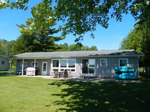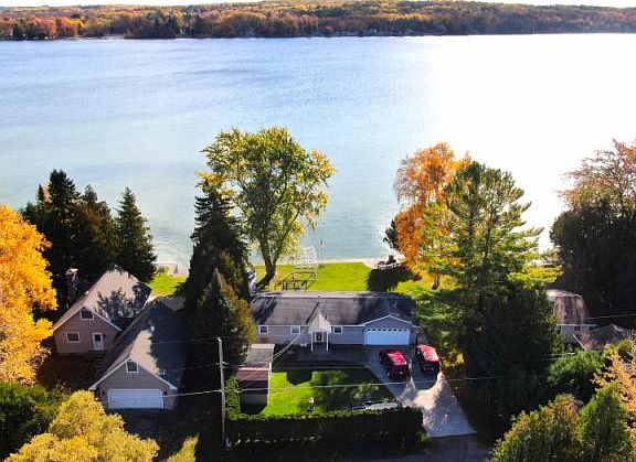 Nestled on 85' of frontage and 134' deep. This year round home, or cottage offers 3 BR, 1 full bath, washer and dryer hook up, a charming kitchen with granite countertops. This home has been taken care of with love. Here's just a few items, of what this home has to offer: 15x21 open living/dining area, with a 6' lakeside doorwall and 16' of pure windows for the most incredible panoramic views of Hubbard Lake and the well landscaped yard. 21x24 Attached Garage. Two 10x12 storage sheds. Stamped concrete adds so much beauty to the driveway, back covered porch and patio, sidewalk; lakeside front patio AND side walk (at water's edge and around bonfire pit). ALSO - the garage floor is stamped concrete, to look like stained oak wood flooring, it's amazing! New well 2021. Natural gas, F/A furnace, insulation in walls and attic. Maintenance free dock, bench and stairs included. Seller has pontoon and electric hoist for sale, but not included.