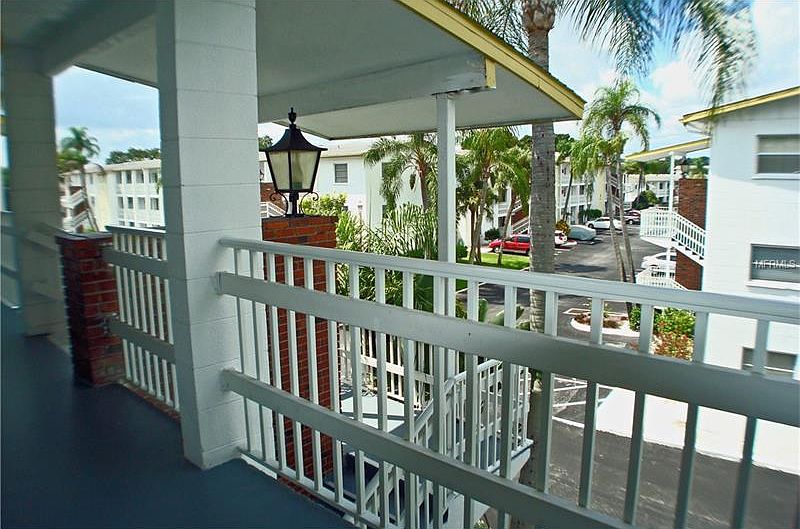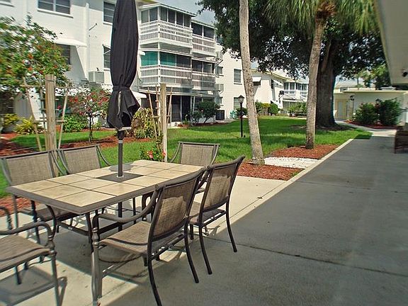 Desirable top floor end unit! This is one of the rare end 2BR/1BA floor plans & is turnkey furnished. Both refrigerator & water heater replaced in 2016; A/C system in 2013 & serviced yearly. Tinted vinyl-sliding windows & screens on lanai offer a great sense of quiet & peace. No pets. Low HOA & taxes make this a cost-effective winter or full-time home. New roof on K-bldg just last Dec. 'First Bayshore' is an active, very popular, 55+ condo association with a sparkling (heated) swimming pool & exterior shower. Outdoor spacious patio next to the clubhouse has charm. The updated & remodeled community laundry has plenty of machines for all. Popular with snowbirds! Close to shops, library, bus stop, restaurants, banks... and only 15-20 minutes drive to fantastic beaches. Interested? Shouldn't wait...