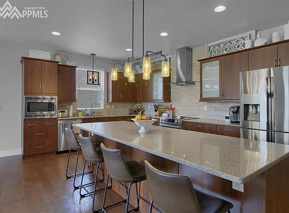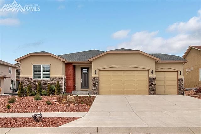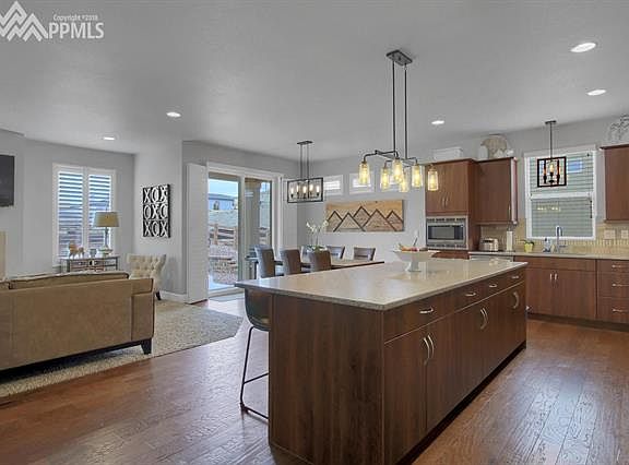 Former builders' model is a stunning home. Located in sought-after Wolf Ranch and Academy District #20 schools. Energy-efficient 2x6" construction. Enjoy family living or entertaining in this light and bright open floor plan with gourmet kitchen with tons of upgraded cabinets, quartz counters, stainless steel appliances and roomy island. Main-level master features walk-in closet, 5-piece bath with quartz counters and beautiful soaking tub. All secondary bedrooms are a great size, basement bedrooms have walk-in closets. Enjoy decorator touches throughout the home. You will love the huge laundry room with mud room area with bench. The finished basement is a paradise with large family room plus a game room area, large storage area, two large bedrooms with walk-in closets and a full bath. Easy maintenance yard includes Xeriscaped front yard and automatic drip sprinkler system.