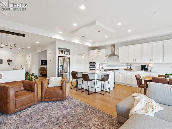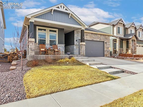 You're going to love this one!! Large Sprawling Ranch Style home in a quiet neighborhood located in in the coveted Banning Lewis Ranch Community. The stunning wide plank hardwood floors throughout the living area of the main level will have you gasping as soon as you walk through the front door. The main floor plan is perfect with a front bedroom, a flex room, and a spacious Master bedroom and bathroom. The gourmet kitchen is stunning with white quartz and an abundance of white shaker cabinets. Plenty of room in the partially finished basement with a large entertainment room complete with a wet bar. The basement also has 2 different storage areas with one being perfect for an exercise area. The covered back patio overlooks a beautiful open space and supplies a great view of Pikes Peak. Make sure to put this one at the top of your list and get in as soon as you can!!