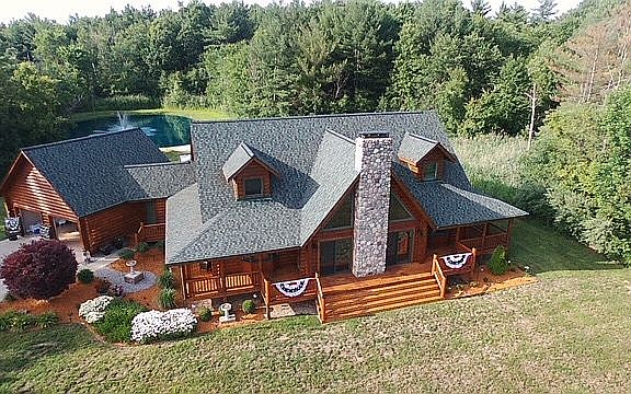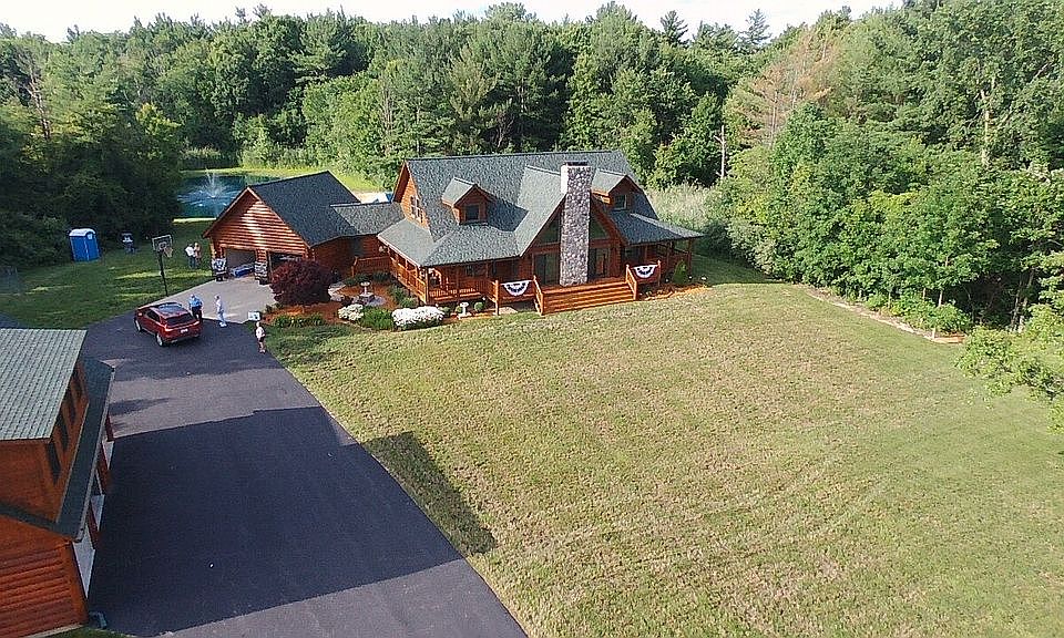 Custom log Home w oversized 2 car garage attached. 2nd detached 1200 sq ft 2 1/2 car log sided garage w loft area. Paved driveway