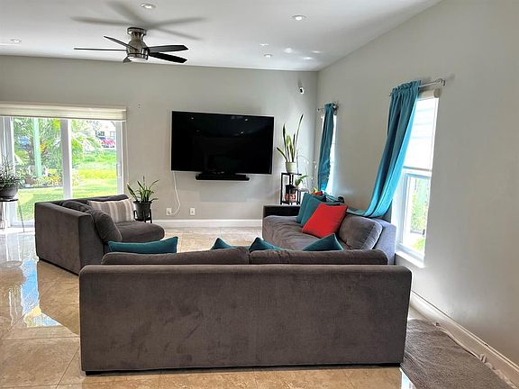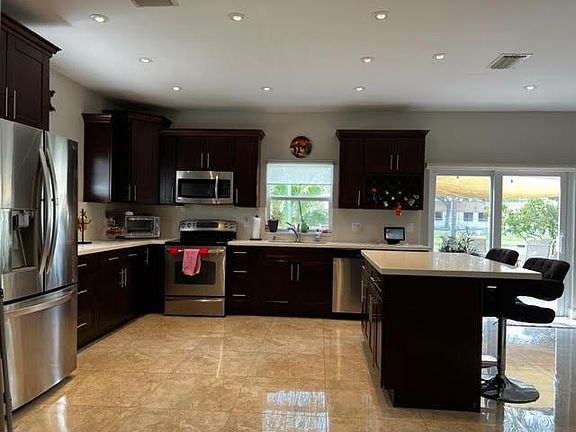 Come and see your next home! Beautifully updated contemporary house with 2 car garage and only a 2 year roof!! Updates include designer kitchen with all wood cabinets and quartz countertops, hurricane impact windows all throughout, recessed lighting, updated bathrooms, new wood laminate throughout second story, 24 x 24 tile on first level, no popcorn ceilings, and security system! This gorgeous property is situated on a calm canal with a great private view. Enjoy plenty of fruit trees in the backyard along with aloe vera plants.