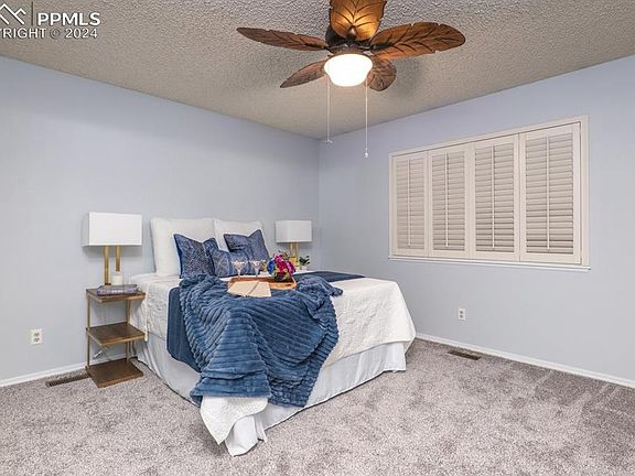 Nestled in the highly coveted Wagon Trails subdivison, this well maintained 2,082 sq ft home offers turnkey readiness with the option to add two more additional bedrooms! Upon entry, the living room's vaulted ceiling makes a striking impression, and the house is complimented with a newer water heater, central air conditioning, and a cozy gas fireplace, ensuring year-round comfort. Recent enhancements include new roof, fresh interior and exterior paint in neutral hues, new carpeting and flooring, updated lighting fixtures, resulting in a clean and contemporary aesthetic. The kitchen and bathrooms boast custom-painted cabinetry while the kitchen is further equipped with newer stainless steel appliances and a pantry. Main level windows are tinted with UV protection for energy efficiency and reduce glare and have custom Plantation shutters.The primary suite features an attached five-piece bathroom and a spacious walk-in closet and is conveniently situated near the main-level laundry. Key features include a living room floor outlet, Plantations shutters for controlled light and privacy, and garage hanging storage. The beautiful low maintenance xeriscape yard with solar lights features an irrigation drip system front and back and has a runoff pond in the front yard which creates curb appeal. The fenced backyard has two sitting areas flanked by trees for ambiance, and the 7 x 7 shed provides additional storage. The half finished basement provides adaptable space complete with a bathroom ideal for guests, or a home office, and potential two more bedrooms. An additonal refrigerator is provided for entertaining needs. Located near the Powers Corridor, enjoy convenient access to shopping, dining, parks, trails, schools, and a hospital. Wagon Trails offers an outdoor pool, tennis, a park to enjoy, walking trails, and seasonal neighborhood events. Click on the virtual tour links!
