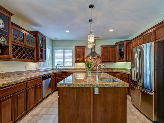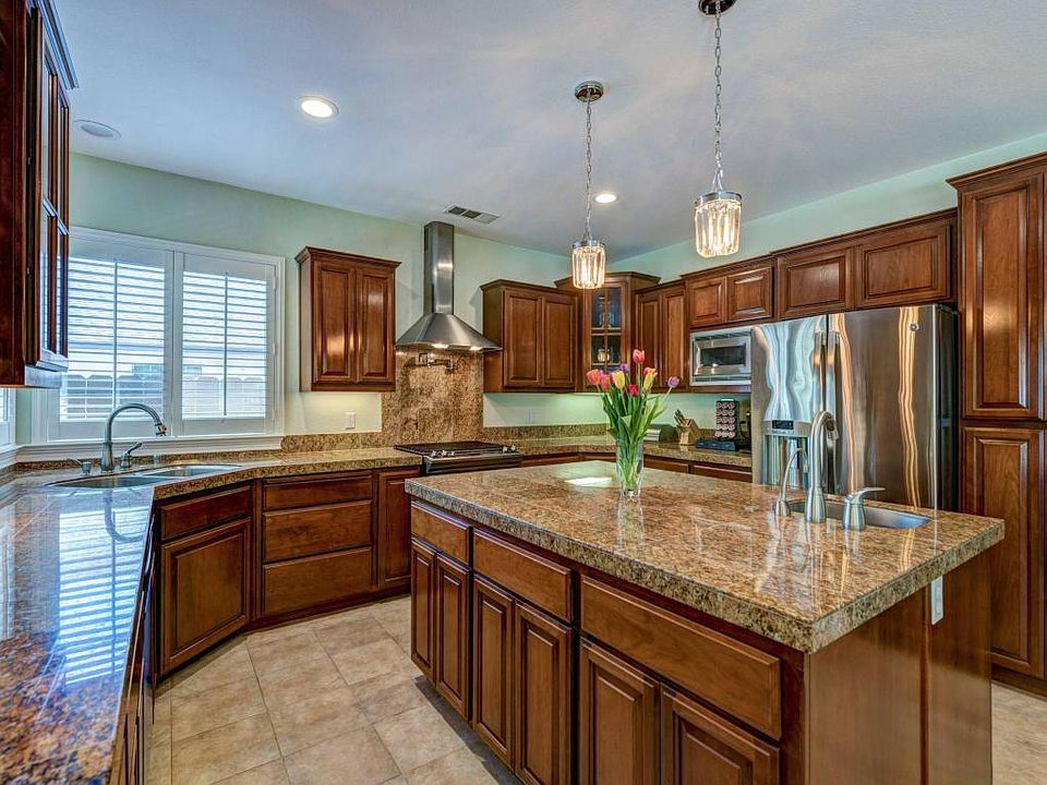 Chef's kitchen with custom cabinetry, plantation shutters, 2 sinks/2 garbage disposals, Instant hot water, brand new Whirlpool range/oven, lots of light, Granite Countertops, split floor plan, crown molding, tray ceilings, tile flooring, dual layered honeycomb shades, large laundry room, 3 car garage, RV Parking, garden beds, backyard has mature trees and shade, firepit,