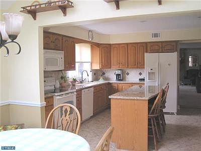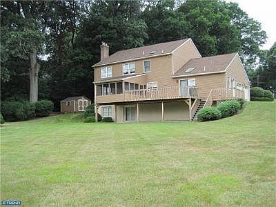 Recent Price Reduction. Peaceful serenity awaits you in this wonderful custom built brick colonial in Solebury Township. A traditional center hall colonial with cathedral ceilings. The dining room leads to a large bright open kitchen, sun drenched breakfast room, a newly renovated kitchen with granite countertops. Enjoy the wonderful large deck with an airy screened room for that morning cup of coffee or snuggle by the fireplace in the spacious gathering room with a wet bar area. A beautiful office library study is located off the living room. All rooms look out to the beautiful open yard. The finished walk out basement awaits your entertaining needs. The master bedroom is waiting for you to unwind, soak in the tub or read in the sitting area, newly redone swanstone shower. All this plus newer heating and air conditioning system,a demenional shingle roof that is 4 years with a 50 year life, freshly painted house, shutters, trim and siding, new cement garage floor & walkway. Taxes were reassessed for 2012.