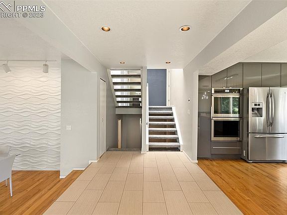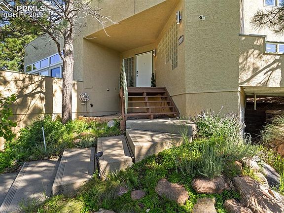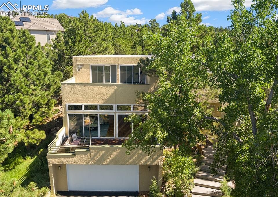 Welcome home to the private oasis you've been dreaming of! A one of a kind custom home with a picturesque setting. Gorgeous curb appeal nestled in a quiet cul-de-sac with mature trees, boulders, and million-dollar views of Pikes Peak. The floor-to-ceiling windows and double sliders add abundant natural light throughout the house. The remodeled gourmet kitchen greets you with its sleek stainless steel appliances, an oversized island with a Jenn-air induction cooktop, double ovens, stone countertops, and beautiful wood flooring. Adjacent to the eat-in dining area, you'll find a cozy patio, the perfect spot for enjoying your morning coffee while soaking in the serene surroundings. The living room is a true gem, featuring two patio areas that showcase the breathtaking views of Pikes Peak. The room boasts wood floors, a warm gas fireplace, and an inviting atmosphere. Venturing to the upper level, you'll discover two large bedrooms, each complete with a walk-in closet. One of the bedrooms even offers a private deck overlooking a wooded area. Completing this level is a full bathroom. The best awaits on the top level – the oversized primary suite. This luxurious retreat includes an attached 5-piece bathroom with a jetted tub, a spacious walk-in closet that conveniently has the washer and dryer, an adjacent hot tub room for ultimate relaxation or easily used as a home gym, and a rooftop deck that offers extraordinary views of Pikes Peak. You'll find an additional bedroom and updated 3/4 bathroom on the first lower level. The finished basement you'll discover a versatile room that can be an additional family room, game room, or office area. The oversized 3-car attached garage is also accessed from the lower level. Even with a tranquil setting, this home remains close to all the local amenities Colorado Springs offers. Close to hiking Pulpit Park, biking, local parks, grocery stores, dining, coffee shops, military bases, and more.
