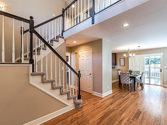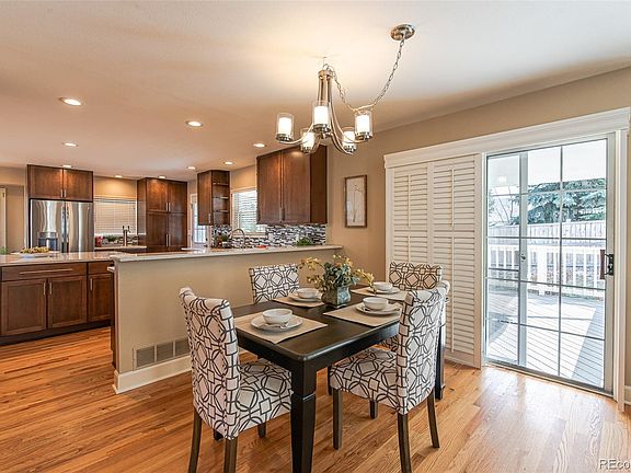 - Description: Hardwood Floor, Chandelier, Corner Bar With Cabinet Storage And Shelving, Sliding Glass Door To Deck
