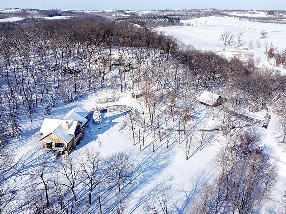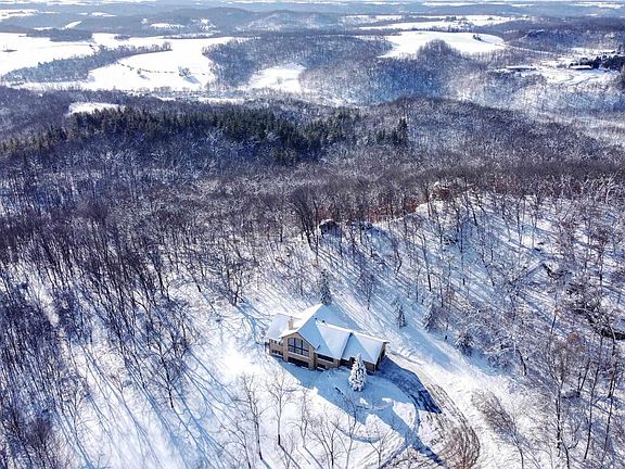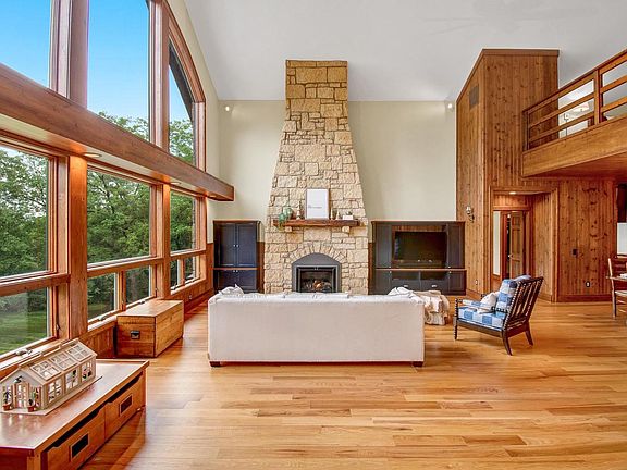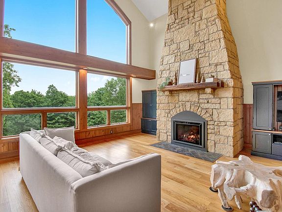 This 40-acre sanctuary just minutes from the west side of Madison offers luxurious + spacious living. As you step inside you are immediately greeted by an abundance of natural light flowing through the large windows creating a warm and inviting atmosphere. The interior boasts 2 stone fireplaces, vaulted ceilings + a modern kitchen with custom cherry cabinetry, Sub-Zero, Wolf + Cove appliances. Step outside onto the patio where you will find a serene oasis overlooking the charming flower gardens, spring-fed pond, majestic trees + rock outcropping trails. Separate guest house ideal for workspace or overflow guests. This tranquil setting provides the perfect backdrop for outdoor entertaining, relaxation + creating cherished memories with loved ones. (2 parcels 008-0049.A + 008-0038.A)