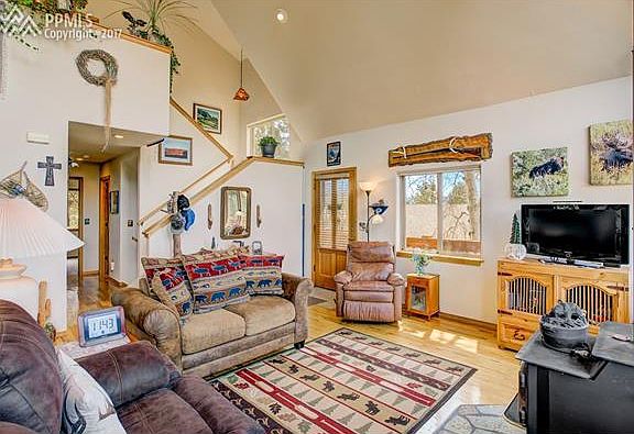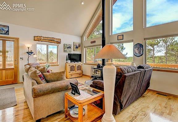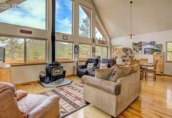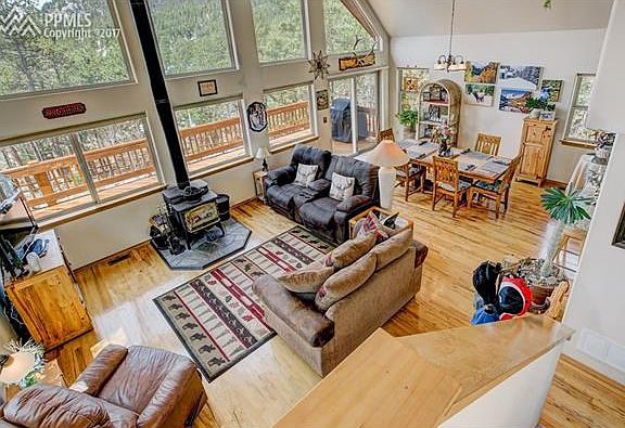 You'll love this three level 2782 sf 3 Br/3Ba/3car mountain home. New hail resistant roof (2015) on home and garage areas, new redwood cedar deck (2016). Private corner lot, level entrance. On the main level is the open great room that is open to the master loft on the second level, a window wall that reaches 23 ft in height, wood stove, granite kitchen with pantry, easy maintenance wood floors. Also on this level is the main bath and bedrooms 2 & 3. Upstairs is the spacious master suite, master bath with jetted tub and separate shower and double closets. Downstairs is the family room with gas fireplace, wet bar and french door access to the landscaped patio with water feature and wired for a hot tub. Also on this lever are a full bath, laundry/utility room and mechanical room. Outside you will enjoy the 3.3 wooded acres with Pikes Peak views, 3 car detached garage with work space, rv parking with 30a dedicated service, fencing for a pet. There is an 11x14 greenhouse + 4 storage buildings. http://www.pikespeakhomesandland.com/homes-for-sale-details/595-BIRD-POINT-ROAD-FLORISSANT-CO-80816/3421945/68/