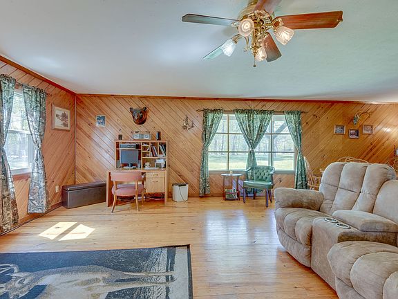 If you're craving solace and space, look no further. Rustic knotty-pine walls and real hardwood floors. Updated kitchen. 2 beds, 1 full bath + extra shower off master. Largely finished basement doubles this home's size: it has 2nd full bathroom, plenty of space for more beds or storage, and a large game room. 21x30 detached garage with power. You'll spend peaceful hours on covered back deck that overlooks the 5 acres of gorgeous privacy.