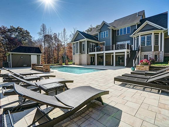Nestled on a three-and-a-half acre secluded lot, this stunning custom home boasts timeless curb appeal in a great location. Features include a warm and inviting interior with elegant hardwood floors, high ceilings, and abundant natural light. The gourmet kitchen boasts granite countertops, custom wood cabinetry, an island, and a built-in wine rack. Spacious living areas include a great room with a stone fireplace and a coffered ceiling, along with a formal dining room. Adjacent to the kitchen is a cozy morning room with a second gas fireplace. The luxurious primary suite offers a tray ceiling, bay window seating, and an en-suite bath with dual vanities, large shower and jetted tub. The second floor boasts 3 bedrooms with ensuite baths, a bonus room and media space. A fully finished lower level includes a home gym, office, and entertainment space. Step into the backyard oasis, where resort-style amenities create the ultimate outdoor experience. Enjoy an expansive deck overlooking a sparkling in-ground pool, complete with a built-in waterfall feature, and surround sound. The surrounding patio offers ample space for lounging, while a cozy fire pit with plenty of seating space invites you to unwind under the stars.