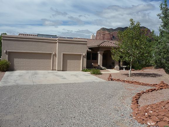 Lovely Southwest Contemporary with view of Bell Rock from the deck. NO HOA or NO VOCA dues, Short Term Rental okay! Beautiful red rock views from this one level, three bedroom split floor plan home. Spacious feel with vaulted ceilings and lots of natural light. Privately situated on .53 acres with room for RV/boat/trailer parking, greenhouse or pool. Wonderfully energy efficient home features a newer owned 3.3kW Photovoltaic solar panel system, solar hot water heating, super high efficiency heating system and 18 Seer central refrigerated air conditioning, low ''E'' windows and good insulation package too. Home has natural gas and Big Park Water and Sewer. Stainless appliances in 2018, recently painted interior and exterior, three car garage with newer storage cabinets and room for your golf cart or shop, covered view Trex deck, bonus storage in the walk in crawl space. Please call Beverly at 630-605-1968.
