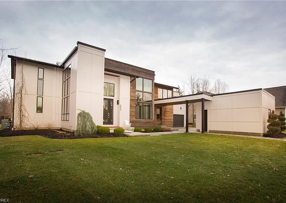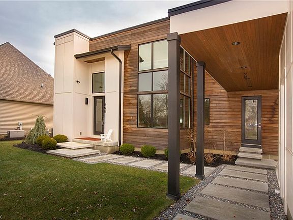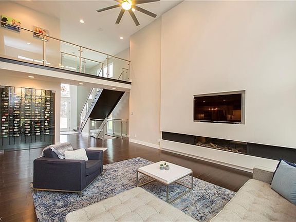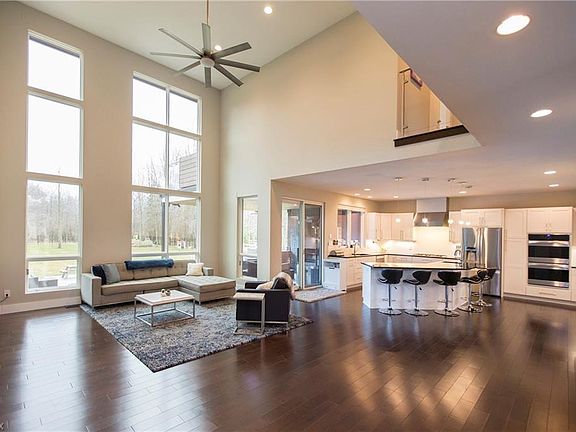 Welcome to this contemporary showplace on an acre of property with rooms bathed in natural light, surrounded by panoramic views! Set back from the street for privacy the front entrance & covered courtyard welcomes you in. The spectacular foyer features an architectural staircase floating to the second floor landing above & gleaming pendant light globes. The minimalist dining room lets the outside in with large windows and an elegant crystal chandelier. The magnificent 2 story great room features a wall of windows to back yard views, a sparkling streamlined fireplace, a fabulous decorative glass wine storage & an open spacious floor plan. The crisp clean kitchen has sleek white Wellborn Cabinets, granite counters & stainless appliances including double oven, French door refrigerator, microwave drawer & gas cooktop. The extended center island provides lots of prep & serving space plus breakfast bar seating. A private office is a quiet retreat with serene views & built-in desks to keep your work organized. 2 chic half baths, mudroom storage & laundry room finish the first floor. Up the glass & metal staircase you find breathtaking views below to foyer, great room & yard. The owner's suite invites you in with a brilliant wall of windows to the backyard & a private sundeck. The spa-like owner's bath features an oversized tile & glass shower, generous soaking tub, double-sink vanity with glass tiled backsplash, a convenient laundry room & the most fabulous walk-in closet/dressing room with built-in make-up mirror/vanity. There is a place for everything in this totally custom designer closet room! 2 other bedrooms share a full bath with tub shower & double vanity. Bedroom four is a perfect guest suite with its own private bath. Downstairs the full finished basement includes a theater, gym, sauna & large entertaining space with room for storage too! Enjoy outdoor living on the covered porch off the kitchen with a cozy wood burning fireplace and built-in grill. Sprawling stamped patio & fully fenced yard with kids delight landscaped play bunker & 3 car garage. Custom interior doors, designer lighting, plumbing & finishes throughout! Make this serene retreat your own private paradise today!