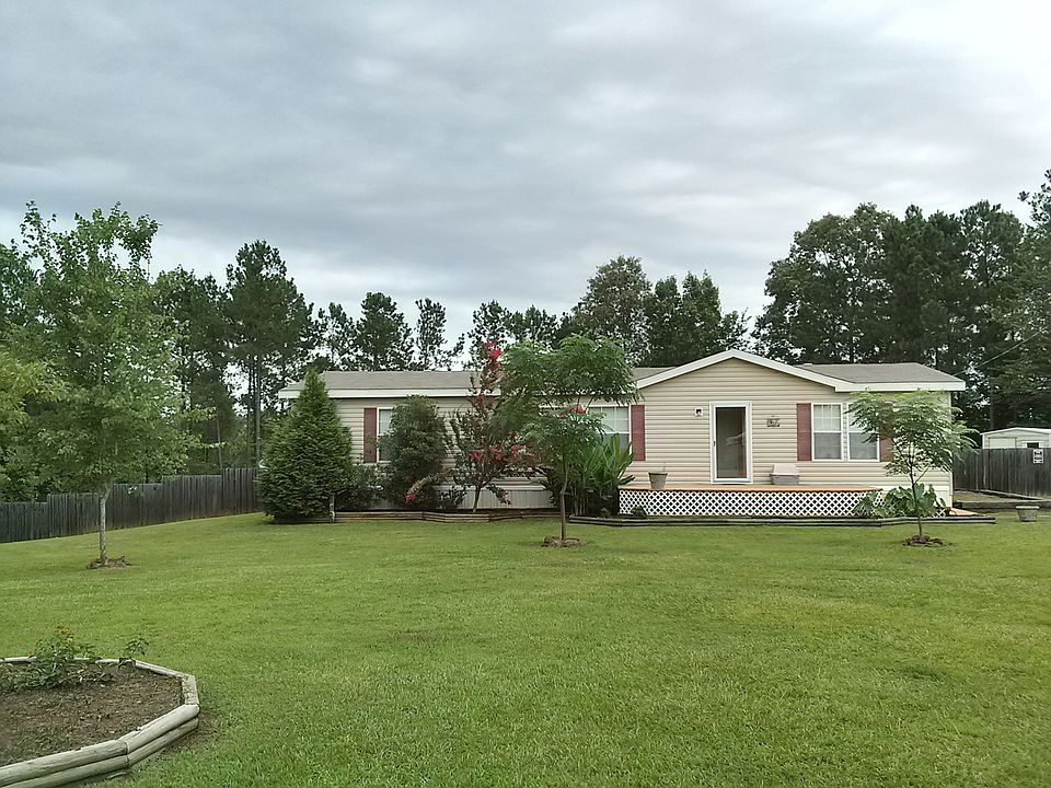 (Purchased lot for $14,500, added manufactured home, porches, fence and landscaping.) Home in excellent condition; was custom built; 3 bedrooms, 2 baths. Large living/dining/kitchen with island/eating bar, stainless steel appliances including refrigerator; sliding glass door from dining area to covered back porch. Large master bedroom with ceiling fan; master bath with garden tub and separate shower, 2-sink vanity, large walk-in closet. Two additional bedrooms with walk-in closets. Wide blinds and window treatments in all rooms, carpet and wide tile in excellent condition. Laundry area off kitchen opens to back porch. Covered back porch has 3 ceiling fans and electrical and propane hookups. Front porch 10' x 25' recently treated with Deckover. Property nicely landscaped with trees, shrubs and flower beds. Large fenced backyard, utility buildings. New 3-ton air conditioner installed in 2013.
