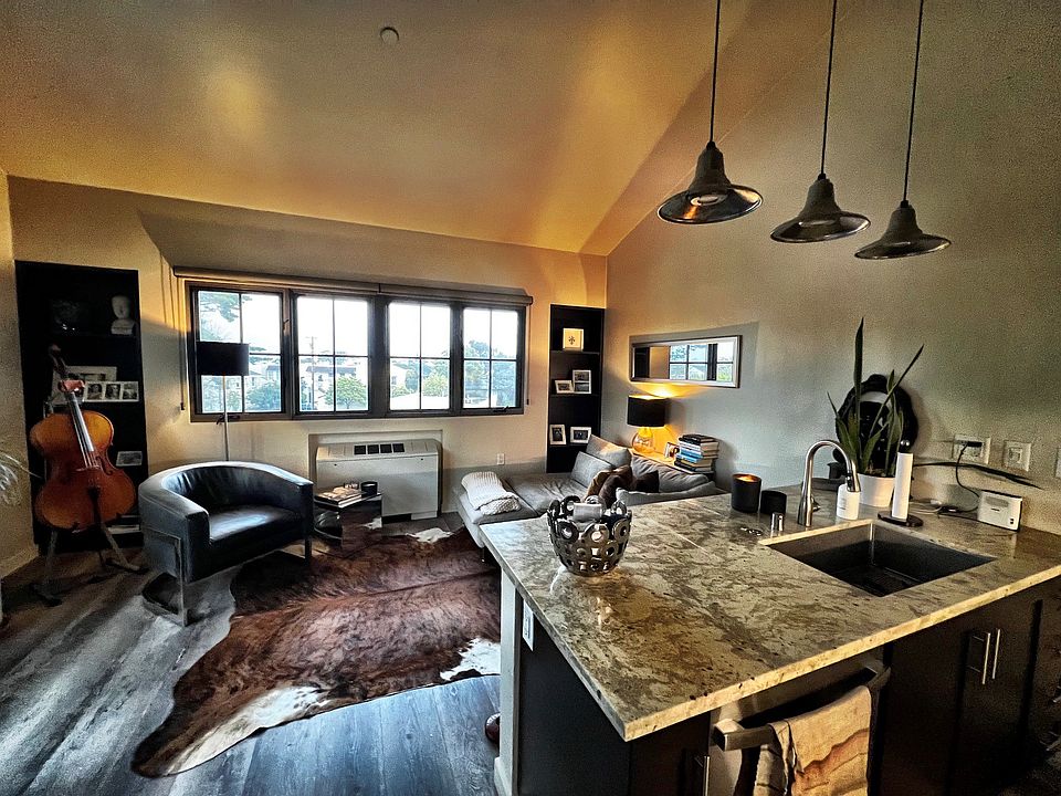 One of a kind, contemporary, class A studio loft has vaulted ceilings, a view over roof tops of Monterey Bay. Upgraded finishes of granite counters, Stainless Steel appliances, and floors of engineered wood finish plank. The living area has a large dining bar, kitchen and a bathroom on the lower level with the loft above. Loft features a half-high wall of built-in shelving some tenants use as their dresser for clothes, towels, etc. The property is quaintly situated downtown amongst historic adobes, two blocks to the bus station, across the street from Trader Joes, Chipotle, Pete's Coffee and Tea and Yikes. One block away are the beautiful gardens at the Cooper Molera Adobe, Alta Cafe and Bakery, and Cella restaurant. Alvarado Street is a short three block walk. Please apply through Zillow. Term: This would be a one-year term. Utilities: Tenant pays for own electricity and gas so you control the cost of utilities. Water is on a submeter so you pay for what you use. For sewer, the city charges a flat rate which is in addition to your rent Smoking: Prohibited - this is a no smoking building. Pets: Dogs are allowed with a $1,000 pet deposit. No cats allowed.