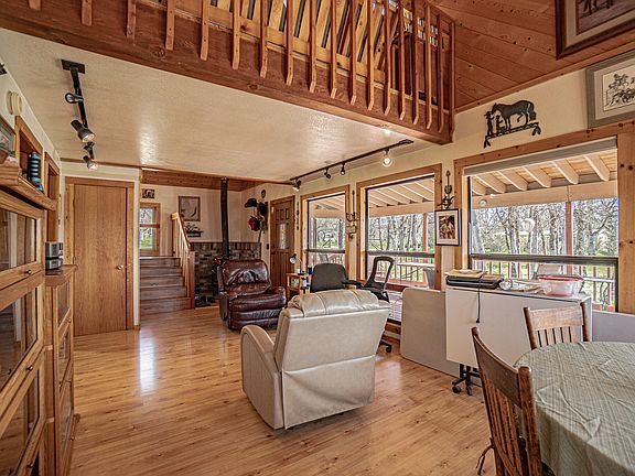 This beautiful hobby farm is a perfect set up. The home sits on 5 acres and has several oak trees in a country setting. The home, built in 1989, has a wrap around deck which is perfect for entertaining. Downstairs you will find a living room, dining area, primary bedroom, kitchen, laundry room and 1.5 bathrooms. Upstairs you will find a landing area for a family area as well as two additional rooms being used as bedroom and another full bathroom separating the two. The home has vaulted ceilings and plenty of natural light flows within. Outside you will find a garage/shop and a carport as well as several sheds. There is a beautiful barn with four stables and a tack room. The property is very useable! Abundant flowers grow throughout the season. Don't miss the rare opportunity.