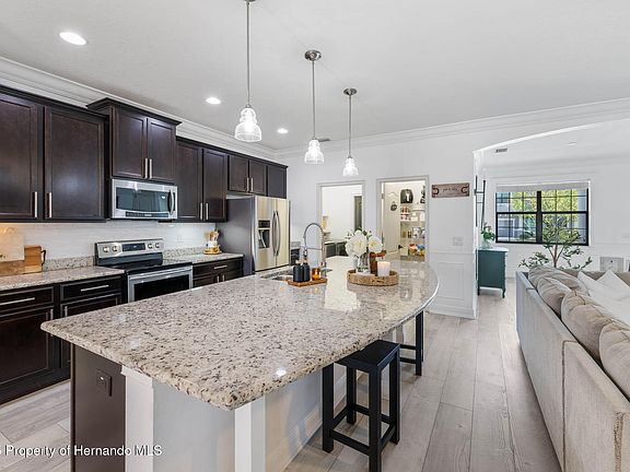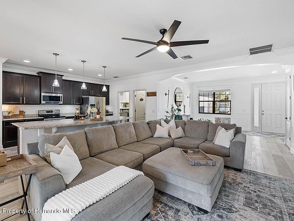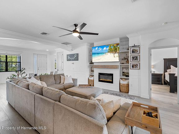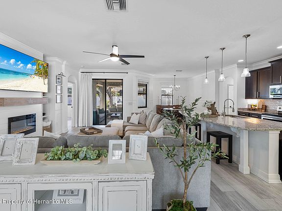 ASSUMABLE MORTGAGE WITH INTEREST RATE OF 3.125!! WHY WAIT TO BUILD WHEN YOU CAN BUY THIS MOVE-IN READY HOME. Welcome to this meticulously maintained 4-bedroom (with a versatile flex room), 2-bath home with a 3-car garage, where pride of ownership truly shines. The gourmet kitchen features sleek stainless steel appliances, real wood cabinetry, and beautiful stone countertops. Enjoy upgraded lighting and an abundance of natural light throughout, highlighting the luxury vinyl plank flooring in the main living areas. The home boasts elegant crown molding, wainscoting, and a custom electric fireplace (with color changing flames) with built-in shelving on each side. Freshly painted both inside and out, this home is move-in ready! The oversized, extended garage offers ample space. The extended outdoor living area includes a covered patio with roll-down sunshades perfect for privacy and outdoor enjoyment. The laundry room has been tastefully updated with new cabinetry and backsplash. Located in a prime area near shopping, top-rated magnet schools, and just under 1 mile from the Suncoast Parkway, offering quick access to Tampa International Airport and the renowned Weeki Wachee Springs. This home is the perfect blend of comfort and convenience—don't miss out!