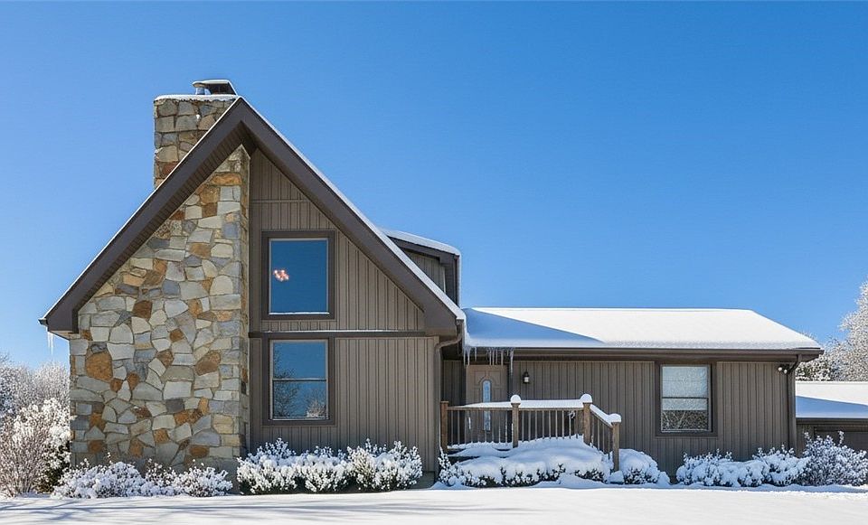 Nestled on 3.6 peaceful acres, this beautifully updated home blends comfort, functionality, and serene country living. Step inside to a warm family room with vaulted ceiling and a stacked flagstone wood-burning fireplace. The heart of the home is the updated kitchen with modern cabinetry, Wolf oven, Sub-Zero refrigerator, convection microwave, wine fridge, and dining peninsula, flowing into a bright eat-in area with access to the covered porch. Two main-level bedrooms feature hardwood floors and neutral tones, paired with a stylish full bath. Upstairs, a loft bedroom/office and another full bath with subway tile and stone counters add flexibility. The lower level includes a bedroom/workout space, utility area, and Bilco-door basement. Outside, a heated 3-car garage with LED lighting and its own panel offers endless use. With a Generac generator and sweeping views, this retreat combines modern upgrades with timeless charm. Backs to land being restored into a natural green space!