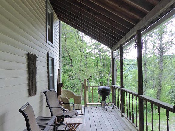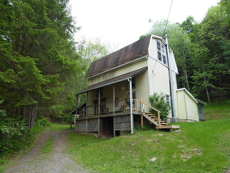 YEAR ROUND HOME OR CABIN....Watch the weather and scenery from the front porch which overlooks the property. You might even catch a sighting of wild turkey, deer or bear! This rustic home is privately situated at the end of a private road on approx. 3 acres. Own some history... The owner said they once for newspapers daed 1887 in the walls. Legend has it that there was a still & bootlegging here in the 1930's. All measurements are approx. and buyer should verify. PLEASE, NO DRIVEBYS, SHOWINGS BY APPOINTMENT ONLY.