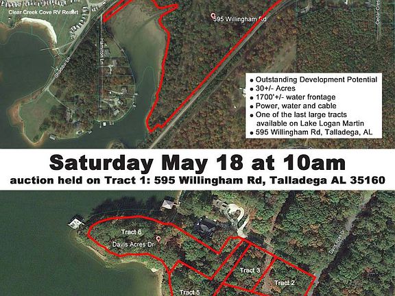 Outstanding development potential! 30+/- Acres with 1700'+/- water frontage. Power, water and cable. One of the last large tracts available on Lake Logan Martin. Auctioneer may call for a different actual starting bid at the live auction.
