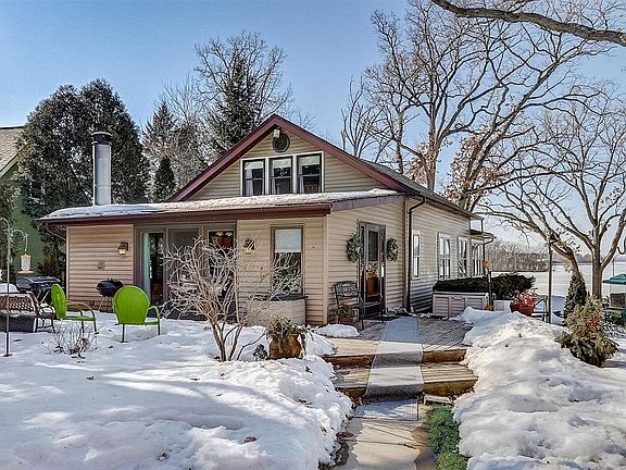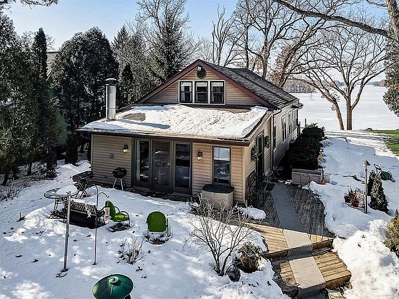 Be mesmerized by the vast and stunning views! Large .72 acre lot, with 103 ft. of frontage with gorgeous views and never ending sunsets. This lot is an example of a lake destination for you to create many memories that will last decades. A 2.5 car garage was built in 2011 with storage above. 10 year old roof, newer furnace, well tank and sewer lateral to the public road. Enjoy hardwood floors, vaulted ceiling and the beauty of natural character throughout. Enjoy a completely remodeled bathroom. There are many possibilities with a ton of value.