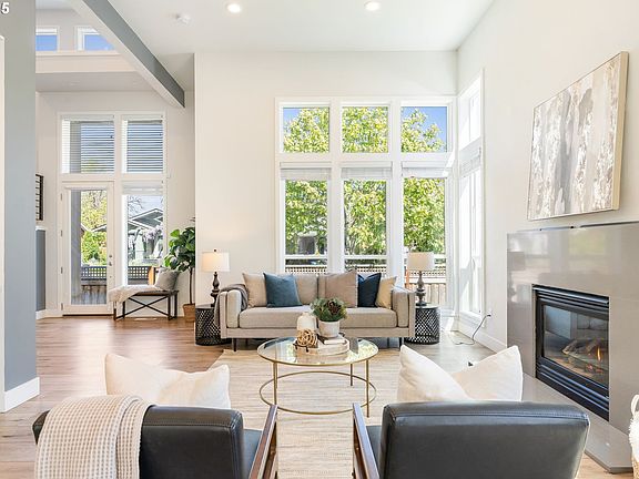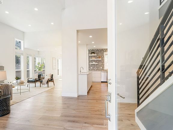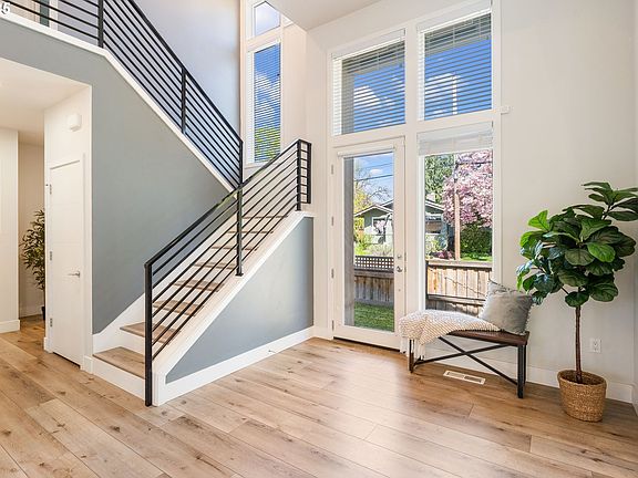 Welcome to your dream home! This contemporary home offers a sleek design, modern finishes, and a luxurious yet low-maintenance lifestyle. You are greeted by warm natural light the moment you step into the two-story foyer. You’ll love the high ceilings, rich luxury vinyl plank floors, and a terrific floor plan with great flow. The spacious living room, kitchen, and dining area connect seamlessly in an open-concept layout. The stunning gourmet kitchen features quartz countertops, two large islands, two sinks, stainless steel appliances, and opens to the living and dining area. The formal dining area extends through the sliding door to the covered backyard patio—ideal for relaxing or entertaining. A convenient main floor bedroom can flex as a home office or guest quarters. Upstairs, you’ll find a laundry room for added convenience, two generously sized bedrooms with large closets, and an expansive primary suite. The primary suite includes a huge walk-in closet and a private en suite bathroom with double sinks, a soaking tub, and a beautiful walk-in shower. Lovely outdoor spaces in your fully fenced yard. Enjoy spring evenings on your covered patio or cozy nights inside next to the fireplace. The attention to detail and craftsmanship can be seen throughout. The home is truly move-in ready. An attached two-car garage offers secure parking and an overhead storage system. Solar panels. Custom blinds. All appliances included. Located in the vibrant Woodstock neighborhood, close to coffee shops, dining, a food cart pod, shopping, and great parks. You will not want to miss this impressive home! [Home Energy Score = 6. HES Report at https://rpt.greenbuildingregistry.com/hes/OR10186004]