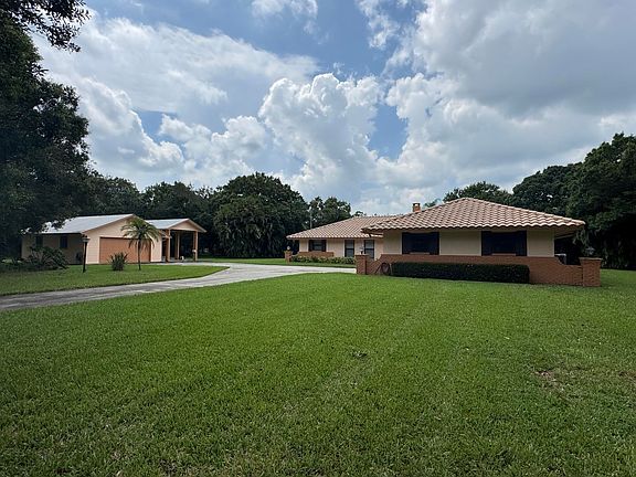 Beautiful Florida Equestrian retreat on 2.3 tropical acres with pool, patio & plenty of space to store your boat, RV and some 4-wheeled toys in a NON-HOA community!Discover a hidden gem that embodies true Florida charm! Enjoy the shaded majestic oaks and surrounded by lush tropical landscaping, this property offers the perfect mix of privacy, space, and laid-back living.Inside, this 3-bedroom, 2-bath CBS home welcomes you with a split floor plan and versatile living spaces -- including a formal dining room, formal living room, sitting room, and office-style room. The galley-style eat-in kitchen overlooks the sparkling screened pool and patio and features a service window to the patio, making it easy to serve meals and drinks while entertaining outdoor Florida details shine throughout from the dual-room wood-burning fireplace for cozy evenings, to the tile and wood flooring that complement the relaxed style, to the hurricane-rated windows that bring in sunlight while offering peace of mind. Added conveniences like a central vacuum system, spacious walk-in closets, a pantry, and ample cabinetry provide both comfort and practicality. Step outside to your own private retreat: a tropical yard with a poolside outdoor shower, abundant space for entertaining, and plenty of parking with a 2-car attached garage, 2-car detached garage, and RV storage. The quiet neighborhood makes this home feel like a private oasis, yet it's close to everything you need.
