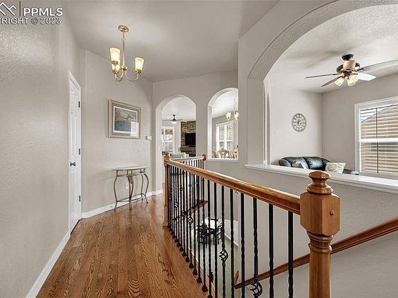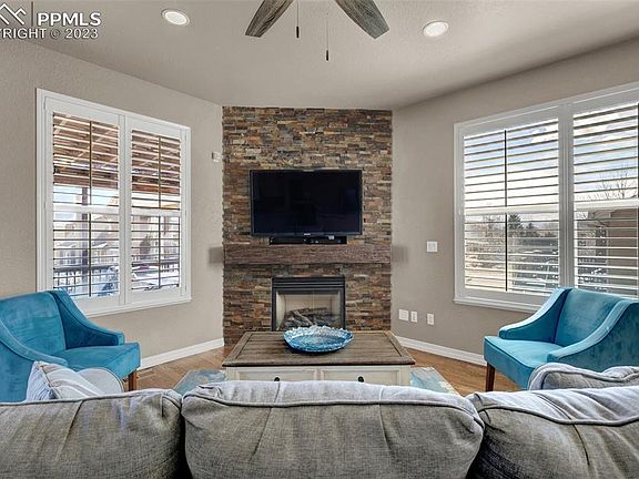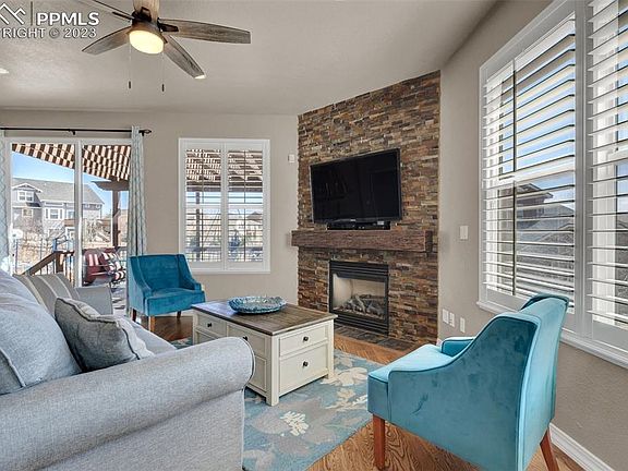 Welcome to this stunning ranch style home in Wolf Ranch boasting Pikes Peak views, 4 bedrooms, 3 bathrooms, and 3 car garage. As you enter this home, extensive hardwood flooring draws you into the great room with floor to ceiling stone fireplace and window framing the Pikes Peak views. The kitchen adjoins the dining room and overlooks the great room making a perfect flow for entertaining. The beautifully appointed kitchen features granite counters, tile backsplash, soft close cabinets, island with breakfast bar, gas stove and pantry. The adjacent dining room is a versatile space that can also be used as formal dining, office, or music room. Unwind in the master retreat offering a luxuriously remodeled bathroom and walk-in closet. A spacious secondary bedroom is just steps from the updated full bathroom. There is laundry on the main and lower level. The deck with pergola covering is the perfect oasis to take in the views. The beautifully finished basement features a family room large enough to host a billiards/gaming area and media niche, two spacious bedrooms, full bathroom, and laundry/storage. This home is situated on a cul-de-sac and the fully landscaped yard provides ample space to run and play. The Wolf Ranch Community offers meandering walking paths, parks and playgrounds, a community center, summer concert series and paddle boarding on Wolf Lake. Excellent location, just minutes from I-25 with easy access to downtown Co Springs, USAFA, award winning District 20 schools, shopping & dining. Tour this immaculate home and you will be pleased with the move-in ready condition – updated kitchen, renovated bathrooms, hardwood flooring on the main and new carpet in the basement, plantation shutters. There is nothing left to do but move in and enjoy the amenities of this beautiful home.