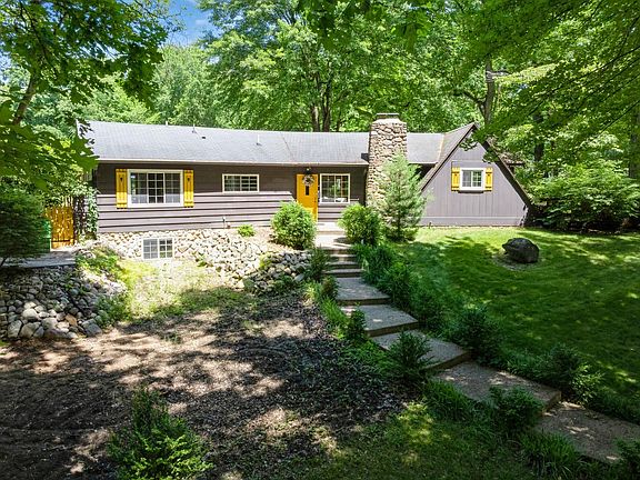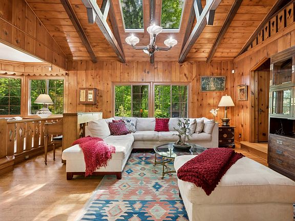 ***Final & Best Offer accepted no later than Friday, July 5, at 6:00pmCST.*** Sellers will review offers on Saturday and respond by Sunday.This expansive 5+ acre wooded property offers a serene sanctuary for those seeking space, nature, and solitude. It also provides a variety of entertaining opportunities, making it perfect for hosting gatherings and enjoying the great outdoors. The single family home exudes luxury and a chalet-style ambiance with its knotty pine wood walls, striking stone fireplace and chef-owner designed kitchen. The focal point of the dining room with its many sliding glass doors and its access to the multiple wooden decks bring the outside in, while the open concept kitchen continues the flow into the warm embrace of the living room. With 2 en suite bedrooms on the upper level and 2 bedrooms on the lower, privacy is possible for owner and guests alike. Unique features are multiple - a pond [!], dog run, sauna and wine cellar are just a few ways you and your guests can entertain! Extend the fun onto any one of the 5 decks, comprising 3,331 square feet, light a fire in the outdoor fire pit and turn on the party lights beneath the gazebo. Whether you're savoring the beauty of the landscape with a morning coffee or enjoying afternoon cocktails, you can create your own retreat or leverage it as an investment through Airbnb rentals, as the current owners have done.Storage space is abundant, both within the house and thanks to two exterior structures -- a 3-car garage and a shed for your gardening and other tools. With a little work, the garage can be used as an artist's studio, an accessory dwelling unit or more storage. The pond contains bass, crawfish and frogs. New water heater installed (2024). New garage doors and roof to be installed in July.New landscaping 2024 includes a Maple tree, rose bushes and more.The burner stove will be sold as is.