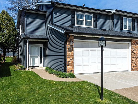 Very well cared for 2 bedroom, 1.5 bath and 2-car garage condo with newer roof, siding, commercial sized gutters, water heater and vinyl windows with Faux blinds throughout. Enjoy the peaceful view of the grass courtyard from throughout most of the unit or the outdoor concrete patio. The kitchen, with pantry and laundry closets within it, opens to the dining and living room with a gas fireplace. Substantially sized Primary bedroom with built-in desk, large walk-in closet and direct access to the full bath with double vanity and separate shower / toilet room. The spaciously sized 2nd bedroom offers two double closets as well. Hand scraped hardwood throughout the main floor with newer carpet upstairs. All appliances stay, including Maytag washer & dryer. A one year AHS home warranty is being included as well.