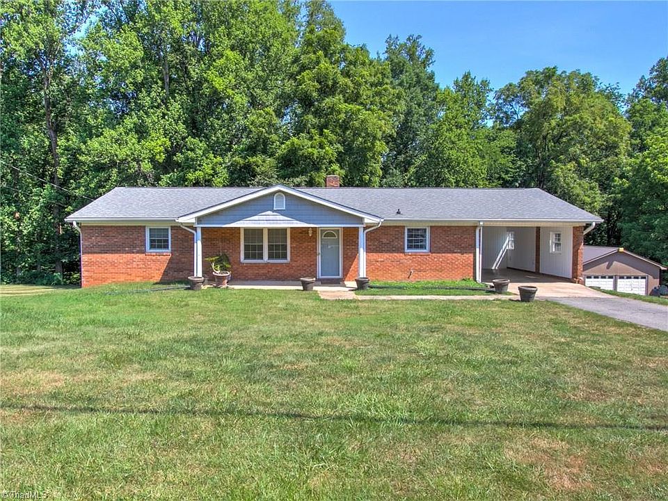 Move in ready rancher nestled in popular Kernersville area, mins to restaurants, shopping, I-40 w/recent roof & vinyl windows. Laminate wood floor. Formal Living, perfect for entertaining. Spacious fireside Den w/fireplace. Updated kitchen w/stainless appliances, breakfast area. Master Suite with en suite bath. Additional beds share updated hall bath. Unfinished basement with fireplace & additional area for perfect workshop. 1 car attached garage & carport. Move in ready. A must see!