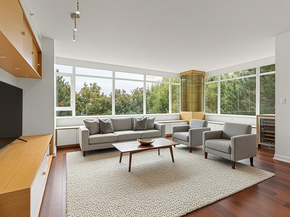 Welcome to 5955 Balsam by Grosvenor. Surrounded by trees, this light filled 3 bedroom, 2 1/2 bath South West corner home is sure to impress. Features include: Air Conditioning, custom millwork throughout, over height ceilings, remote control Hunter Douglas roller shades, Sub Zero wine fridge, integrated appliances, gas cook top, hardwood floors & much more. Deluxe spa-like en-suite bath with double vanity, marble counters, in-floor radiant heat, towel warmer, deep soaker tub & stone surround rain shower. Love the West facing covered balcony plus separate eating nook off the kitchen. Quintessential Kerrisdale…walking distance to cafes, boutique shops, banks, Elm Park, the Arbutus Greenway, Kerrisdale Community Centre & the Vancouver Public Library. 1 pet allowed, 2 parking+ storage locker.