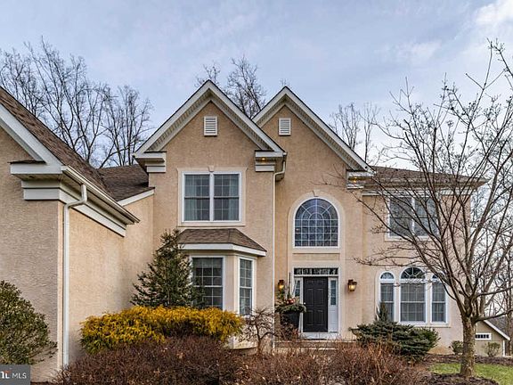 Elegance and sophistication combined make this 4BR Colonial in the much sought after Wooded Ridge Neighborhood a must see. Surrounded by trees and preserved land you are offered the neighborhood feel with loads of privacy and seclusion. Tastefully landscaped and well manicured, the sellers have created an outdoor oasis. This beautiful home is great for entertaining both indoors and out. Two story foyer entryway offering loads of natural light throughout. Hardwood flooring leads to the gourmet, eat-in kitchen featuring cherry cabinetry, tile backsplash, oversized island, double oven, gas cook top, stainless steel appliances, granite countertops and stunning views from each window. The breakfast room overlooks the grand, two story family room which is sure to impress, from the gallery windows, to the cozy gas fireplace and second staircase. Formal Living Room leads to the Sunlit Dining Room featuring a pellet stove that offers ample heat during the colder months. Office/Study with Bay windows, powder room and convenient mud room/laundry off the 3 car oversized garage. Two dramatic stairways lead to the 2nd level. Master suite with sitting room, master bath with jetted tub and separate glass shower, double vanity and linen closet plus his/her walk in closet. 3 additional generous sized bedrooms with views galore and full neutral bath. Don't miss the fully finished, walk out basement! Full sized windows offer natural light, wall mounted fireplace, recessed lighting, engineered hardwood flooring, half bath and workout room are just a few of the highlights. Step outback and enjoy the serenity. The composite deck boasts breathtaking wooded views and overlooks the fire pit, tree house and one car detached garage/shed. Just minutes to Green Lane Park with Hiking, Fishing, Boating and Nature Trails. Easily accessible to the PA Turnpike and Route 309. Schedule a tour today.