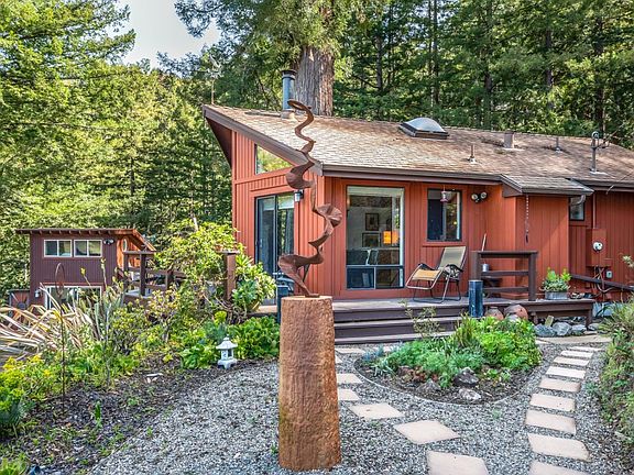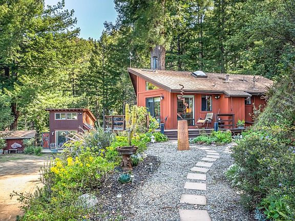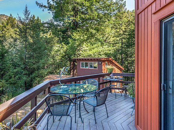 Resting on 15 redwood and oak covered acres (2 seperate APNs), this remarkably complete small home feels like getting away to a private luxury boutique hotel property. Fully insulated with double pane windows, this peaceful retreat with heart redwood interior has been totally upgraded inside and out. Counters are Caesarstone, New Wood Stove is Scandanavian. Convenient outdoor shower off Studio. Outdoor bathtub off Master Bedroom on view deck. 2nd parcel is APN 418-051-020-000 and is 248,620 sf. (approx 6 acres) Living Area Sq Footages: Main House 673, Guest 399, Studio 182.