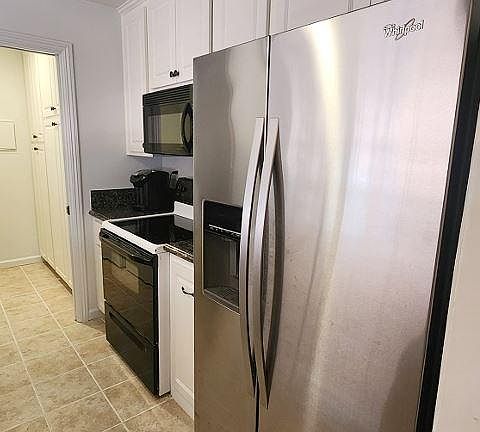 The kitchen features granite counters and custom white cabinetry. It is fully equipped with refrigerator, electric range, microwave with range vent, and dishwasher. Adjacent to the kitchen is a laundry room with additional custom pantry space. The main living area is cozy and welcoming, finished with beautiful wood floors. The L-shape provides an open living area for easy entertaining. Off the hallway is the updated bathroom featuring a full tub/shower and a modern vanity. Through the hallway, the bright bedroom boasts a spacious walk-in closet and a continuation of the wood floors of the main living space.